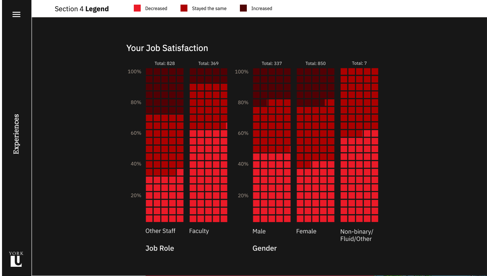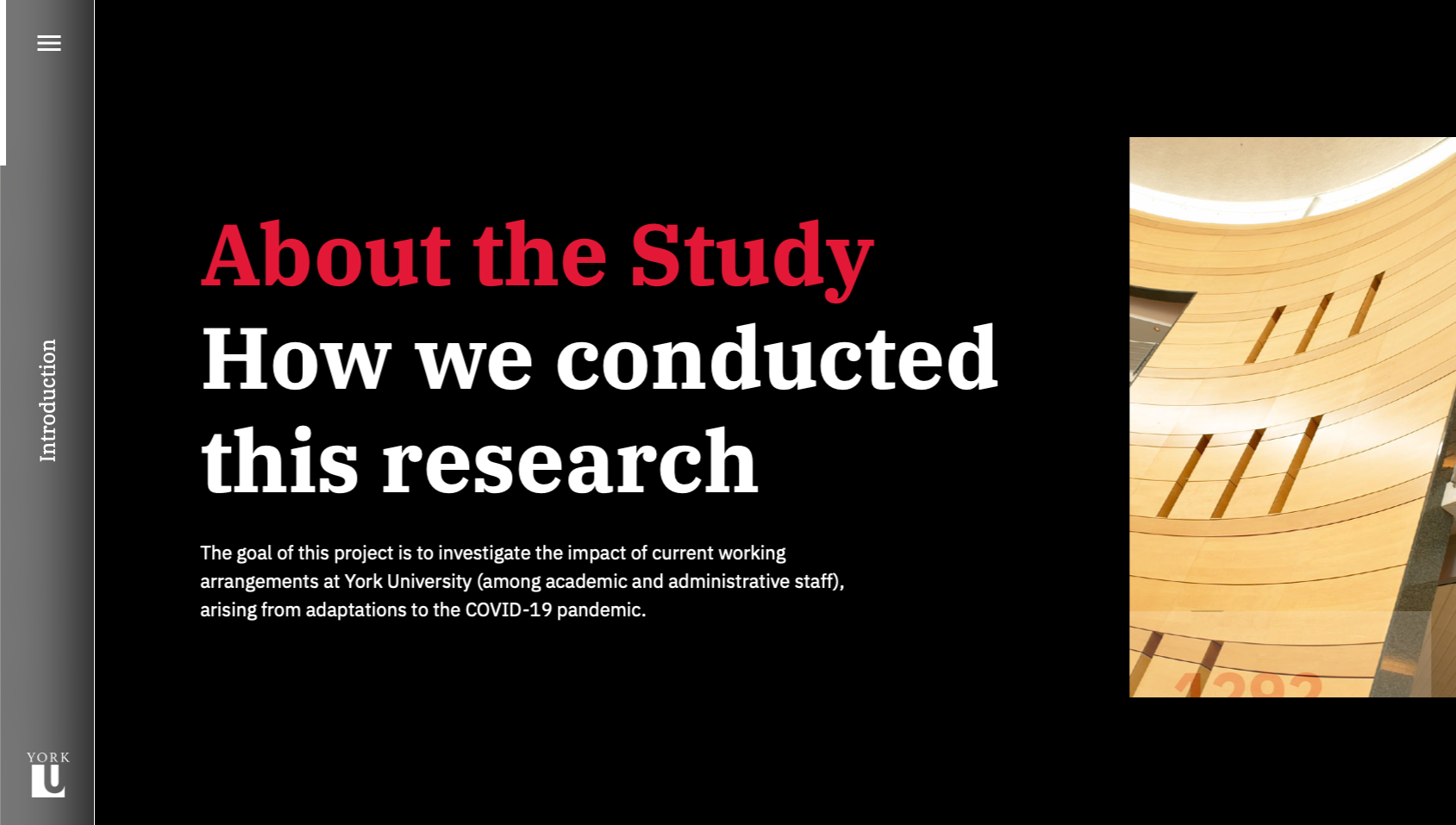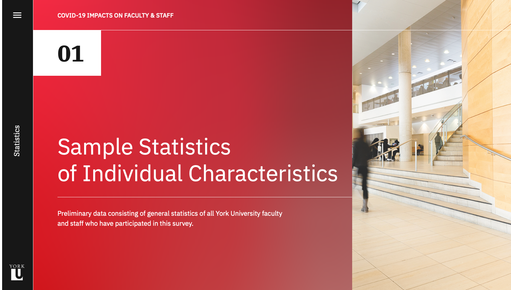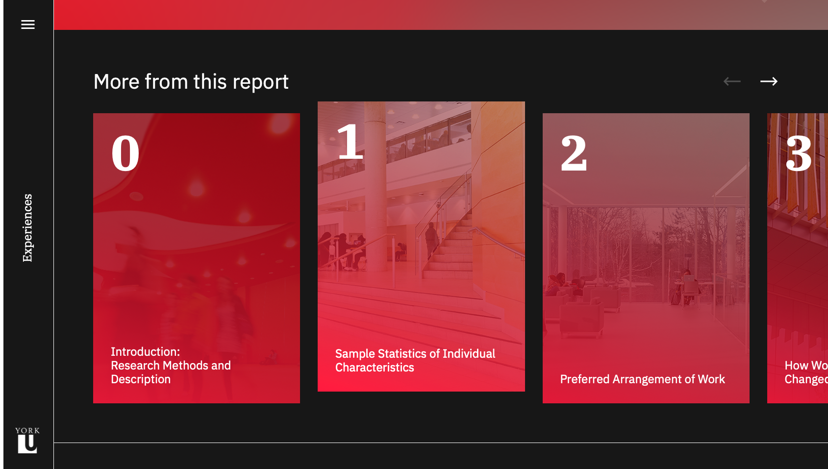 Although the visual branding of the site is centred around the York University colour palette, the layout and interactions diverge from the university's website to create an immersive and engaging experience for readers. The site is custom built to display the content of the study, and each of the five sections of the study are optimized for the chart types they contain. The homepage was designed to scroll horizontally, creating a distinction between the report pages as well as a memorable interaction. The alternating colours and positioning of charts adds visual interest and flow to each page, while the section hero banners contain a custom bright gradient using university colours, which clearly indicate the beginning of a new section.