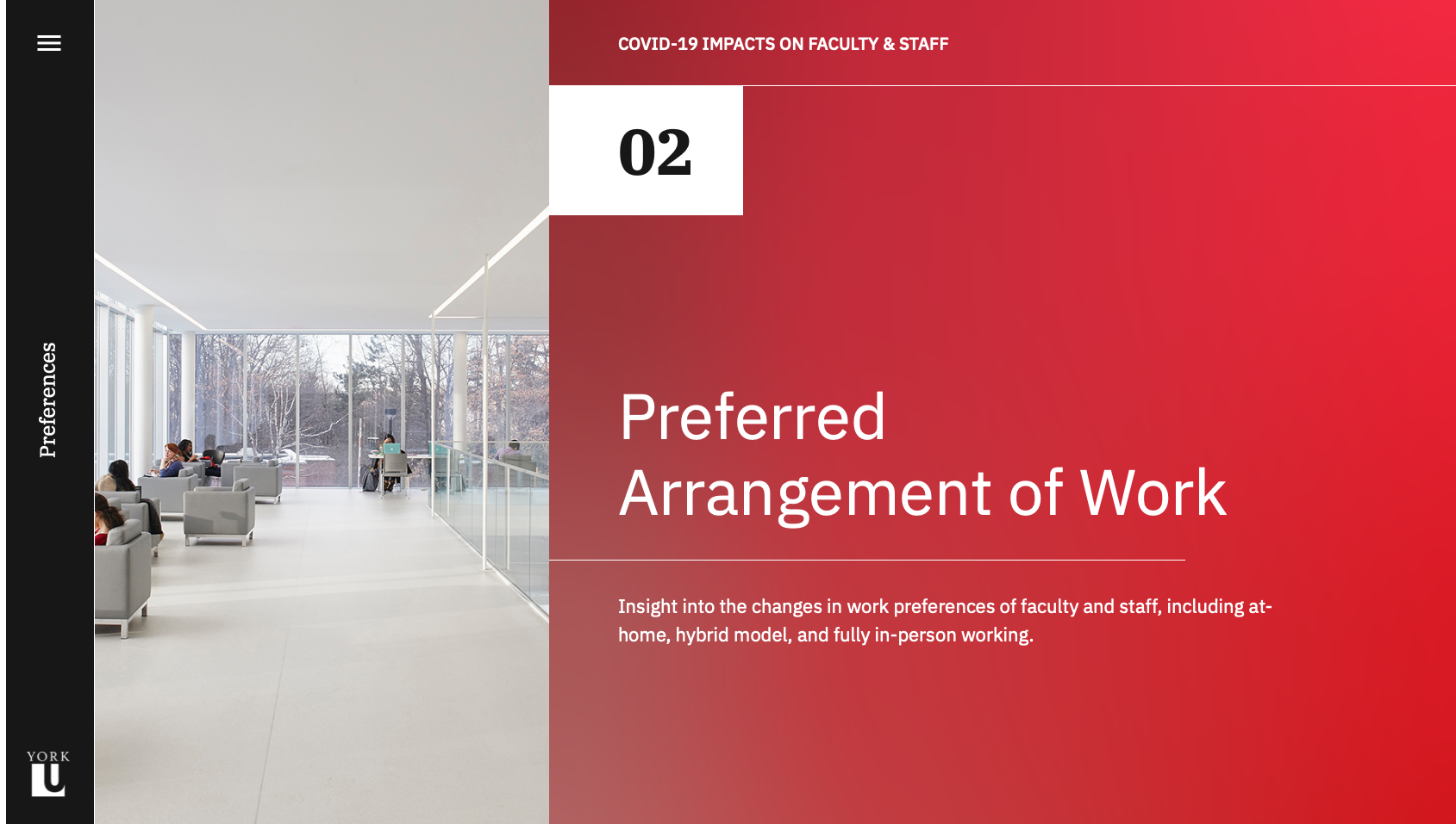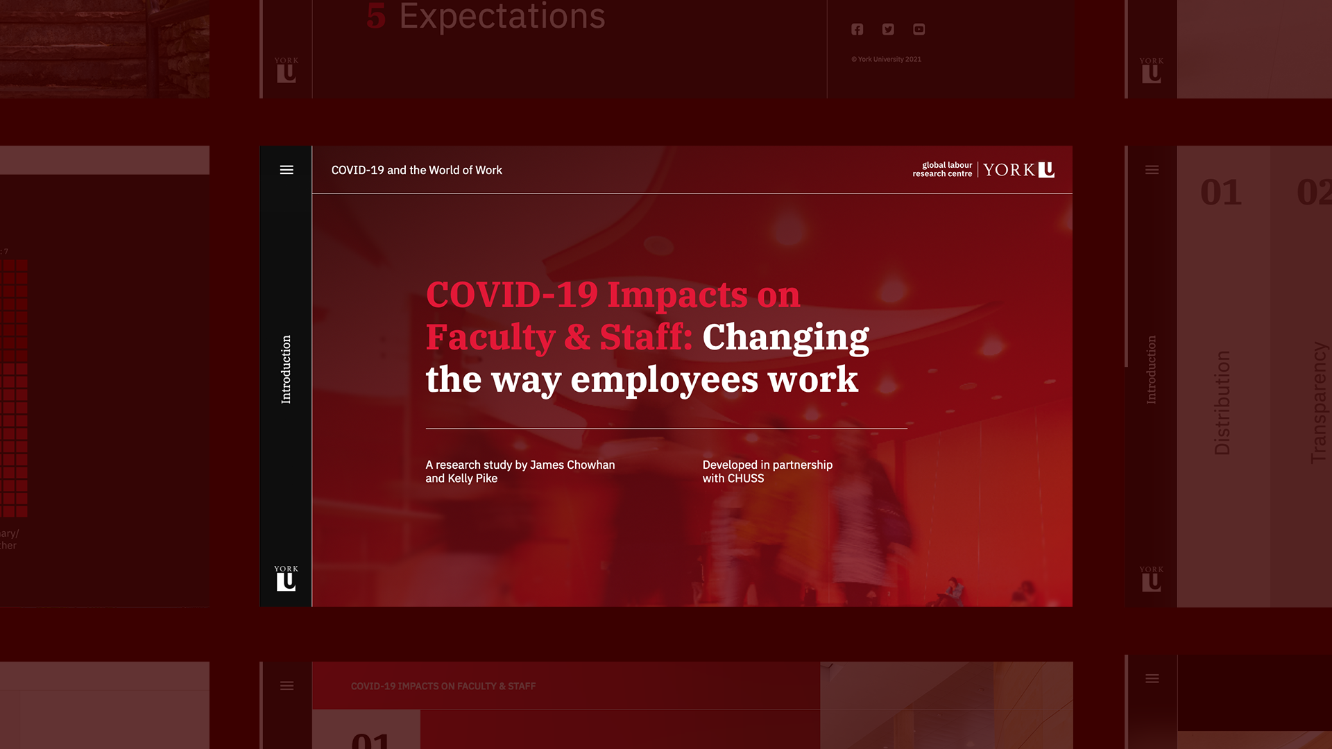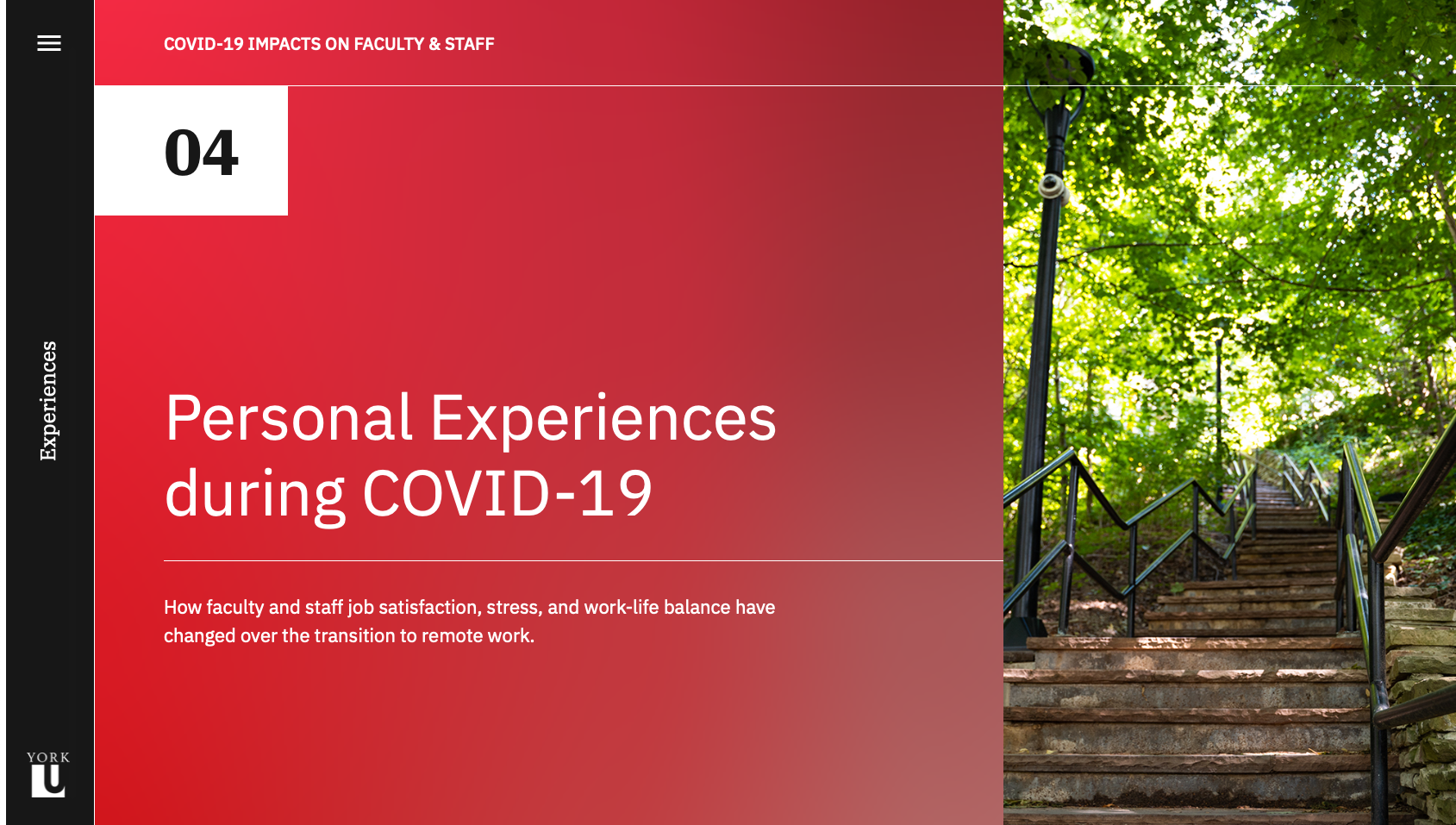 Although the visual branding of the site is centred around the York University colour palette, the layout and interactions diverge from the university's website to create an immersive and engaging experience for readers. The site is custom built to display the content of the study, and each of the five sections of the study are optimized for the chart types they contain. The homepage was designed to scroll horizontally, creating a distinction between the report pages as well as a memorable interaction. The alternating colours and positioning of charts adds visual interest and flow to each page, while the section hero banners contain a custom bright gradient using university colours, which clearly indicate the beginning of a new section.