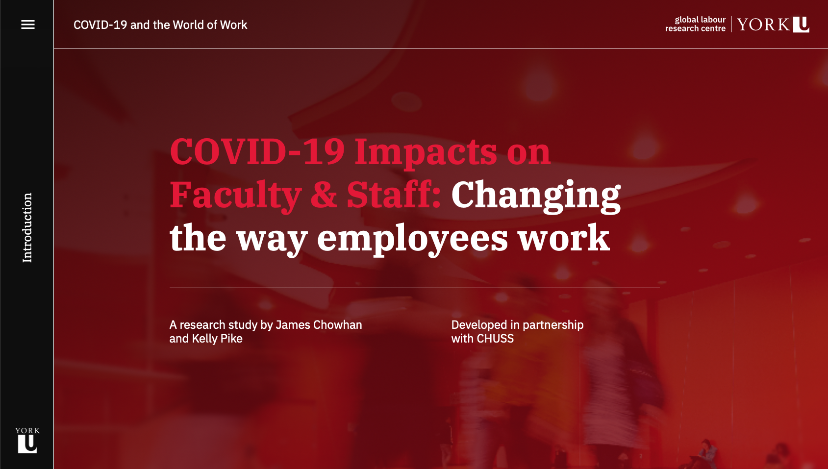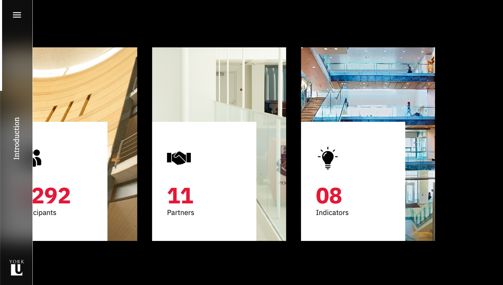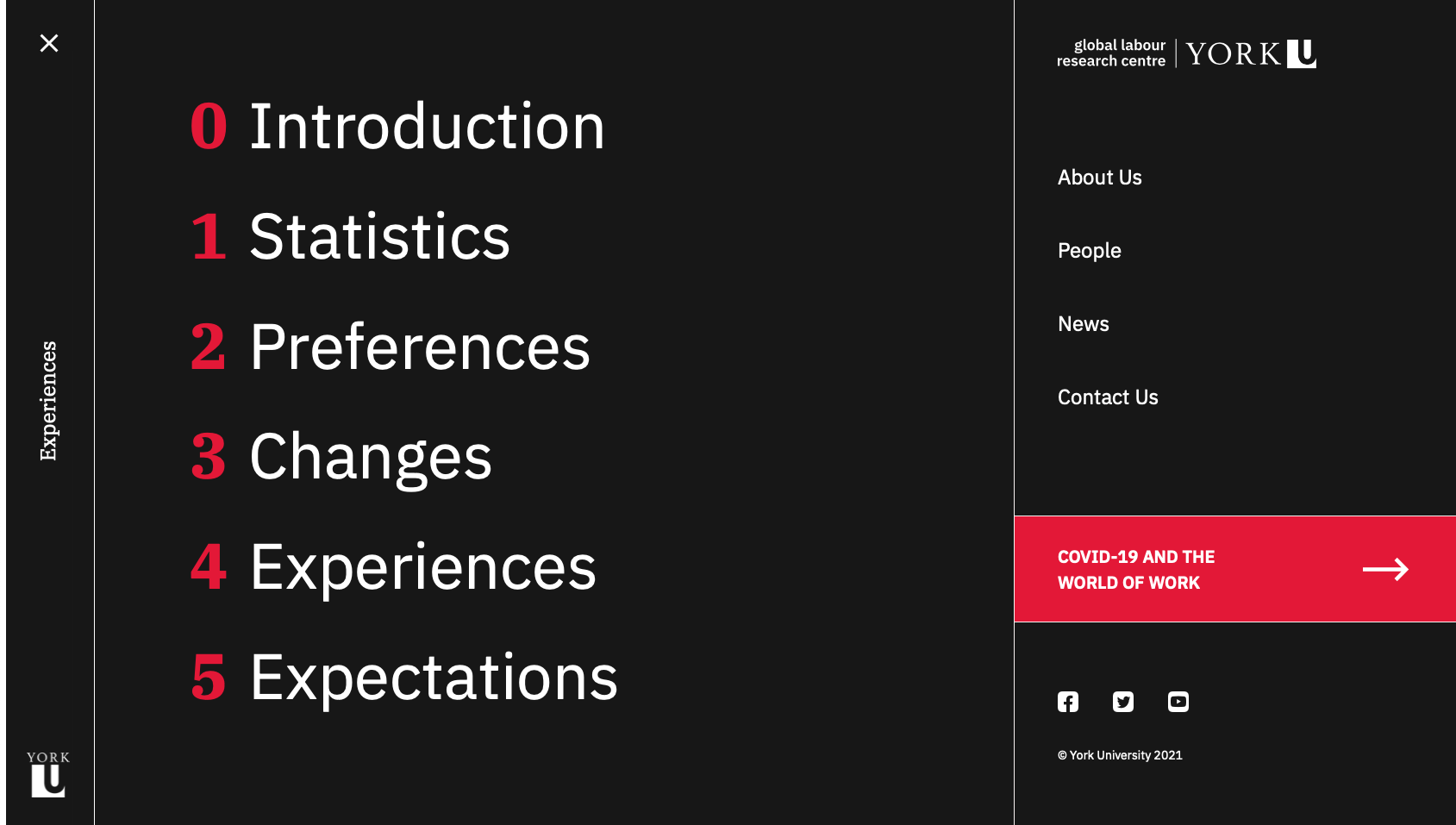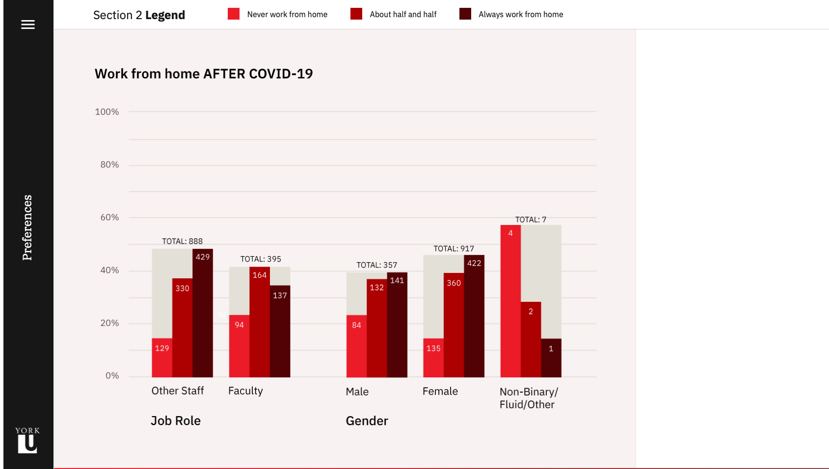 Although the visual branding of the site is centred around the York University colour palette, the layout and interactions diverge from the university's website to create an immersive and engaging experience for readers. The site is custom built to display the content of the study, and each of the five sections of the study are optimized for the chart types they contain. The homepage was designed to scroll horizontally, creating a distinction between the report pages as well as a memorable interaction. The alternating colours and positioning of charts adds visual interest and flow to each page, while the section hero banners contain a custom bright gradient using university colours, which clearly indicate the beginning of a new section.