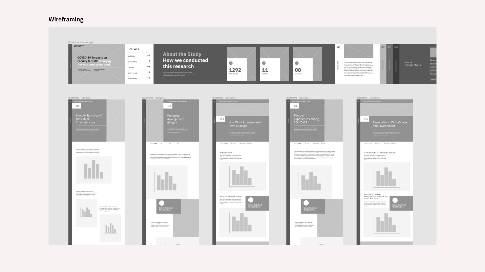 This project was developed over a period of 4 months, and involved much consultation between the researchers to ensure that the data was accurately represented. After the charts were collaboratively developed, the general web layout was researched and hand-sketched to provide a solid launch point for the project. Next, the specific structure and content of the site was detailed, followed by the development of wireframes using Figma. These wireframes were later expanded into high-fidelity mockups following the development of the website style guide, which included typographic hierarchy, colour palette, vector assets, images, and more. Finally, the site was developed, tested, and launched via a press release from the GLRC.