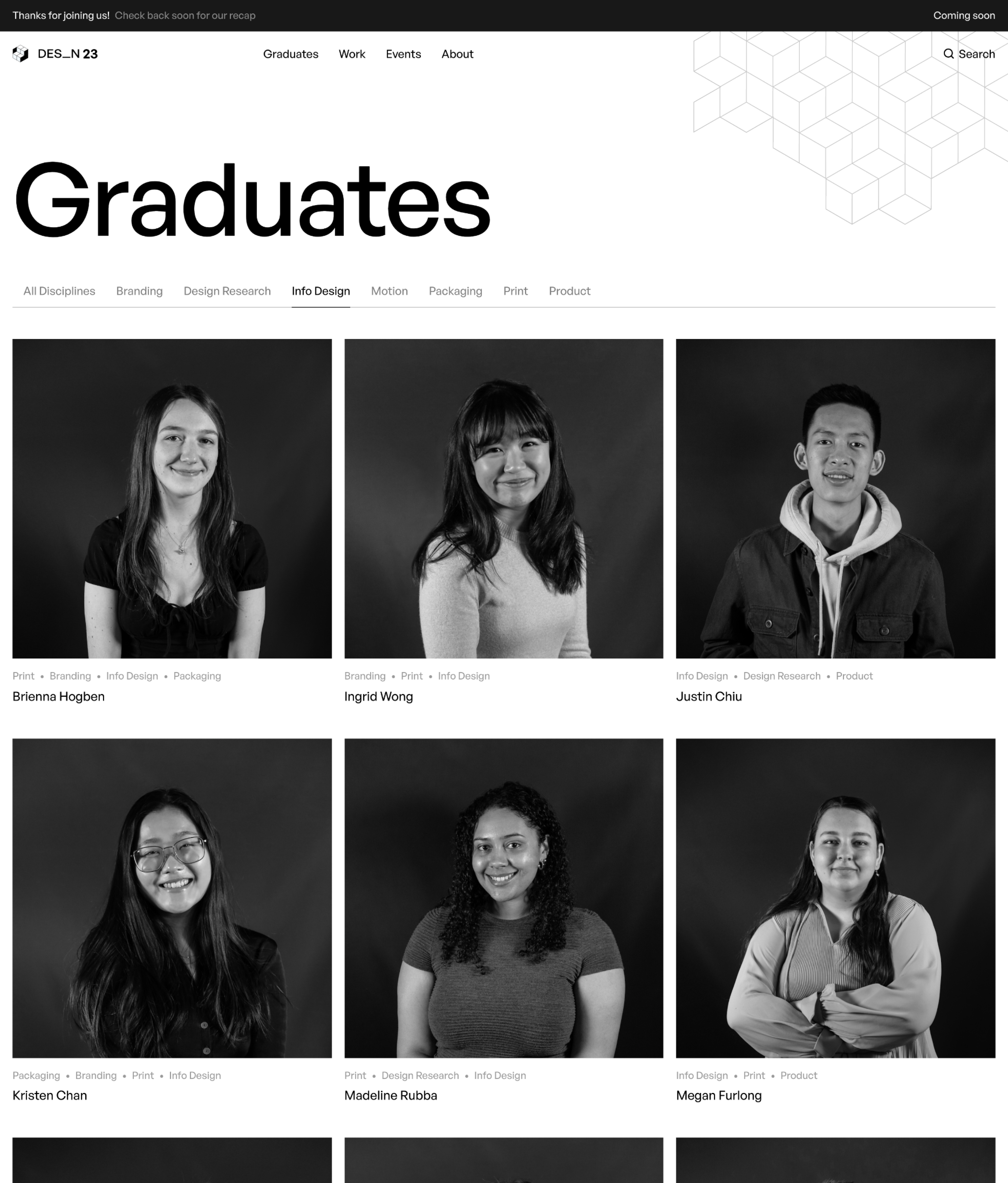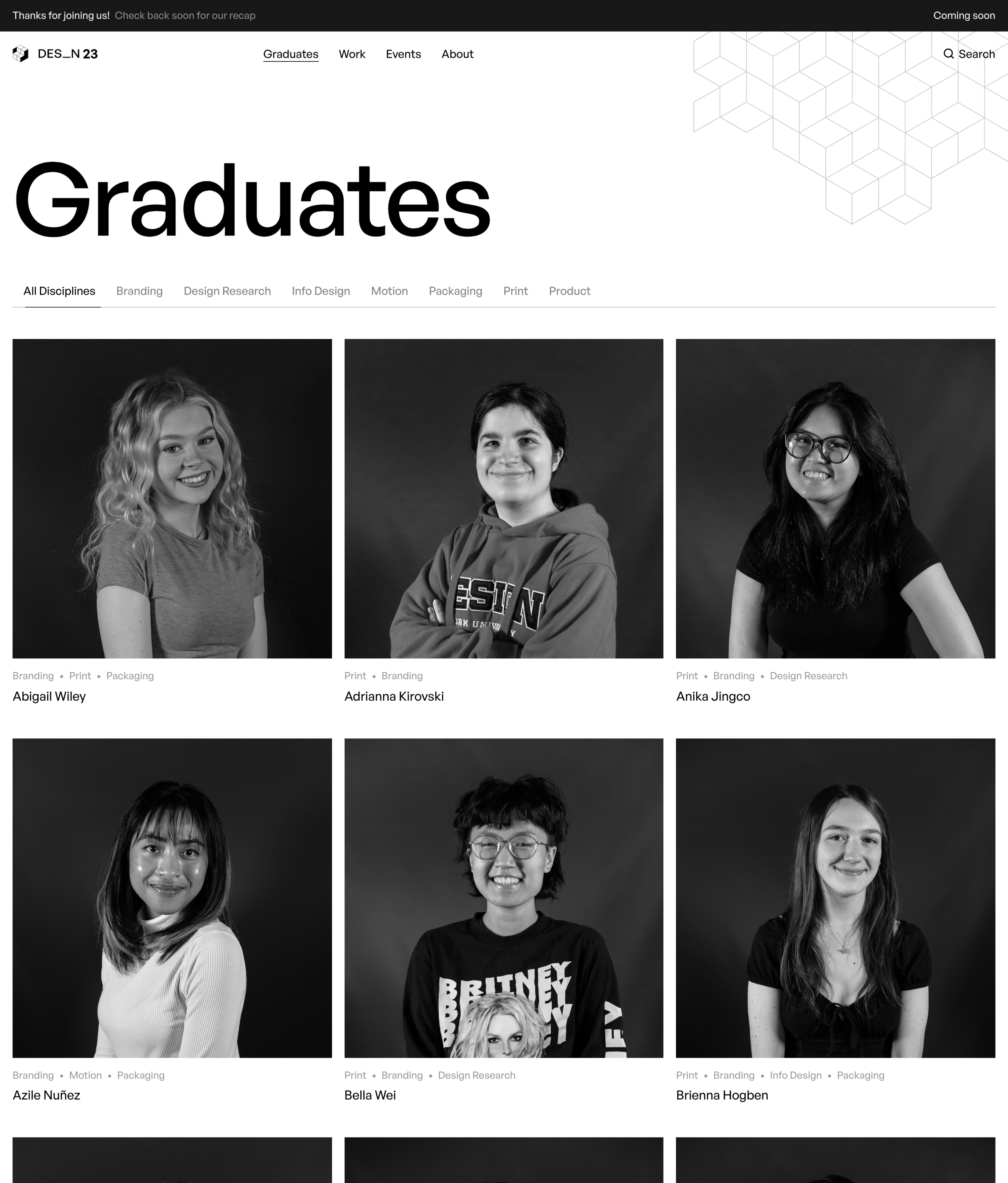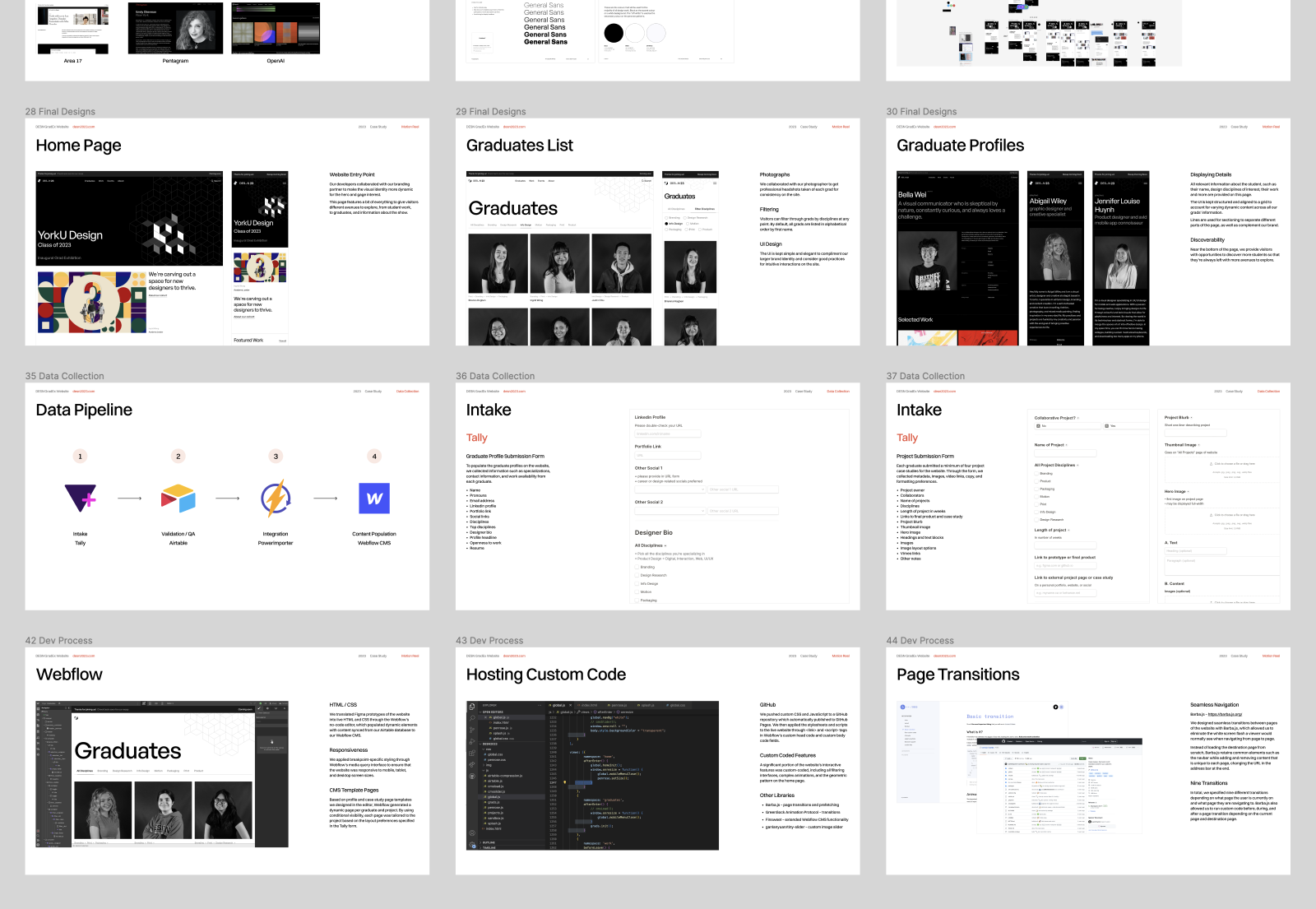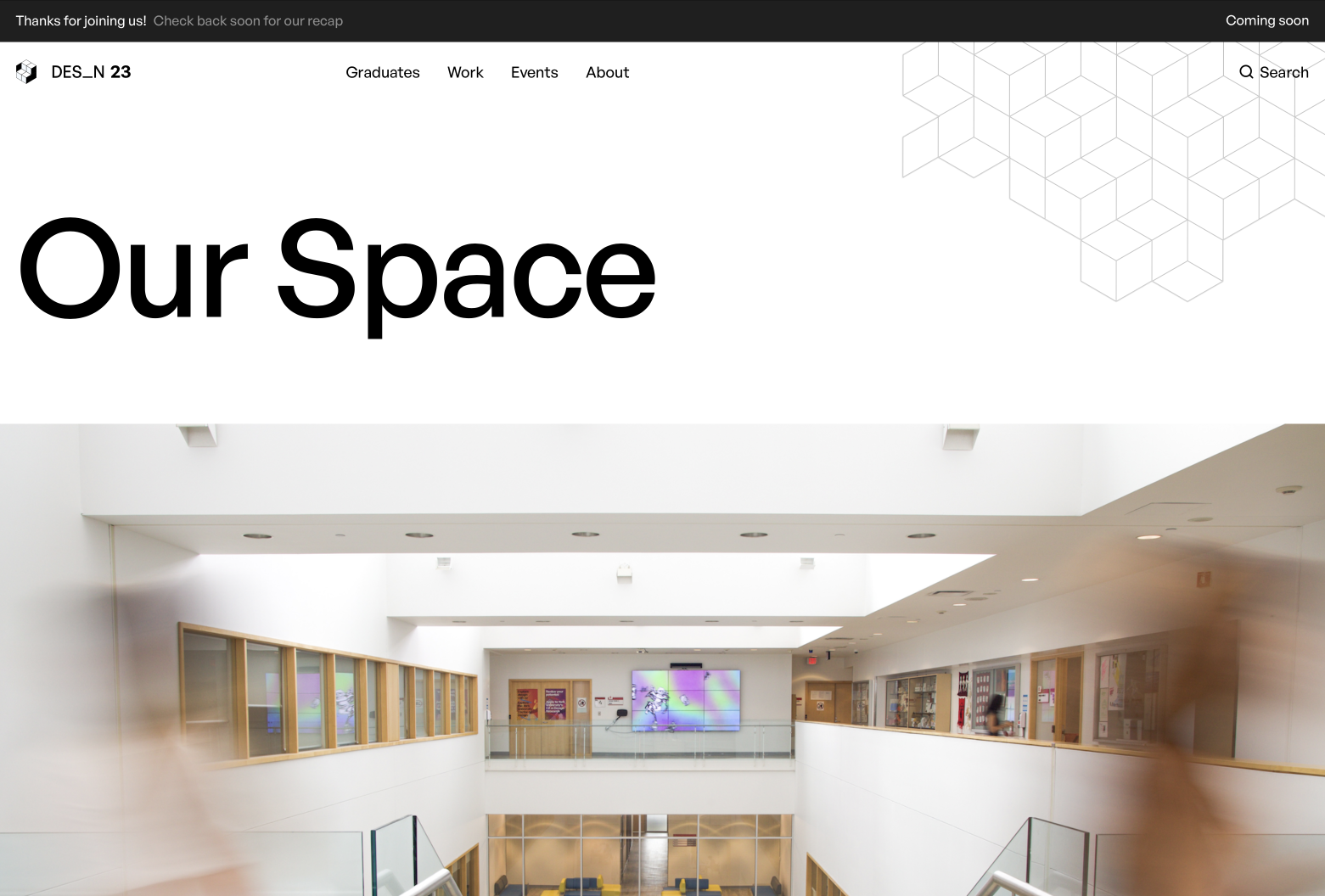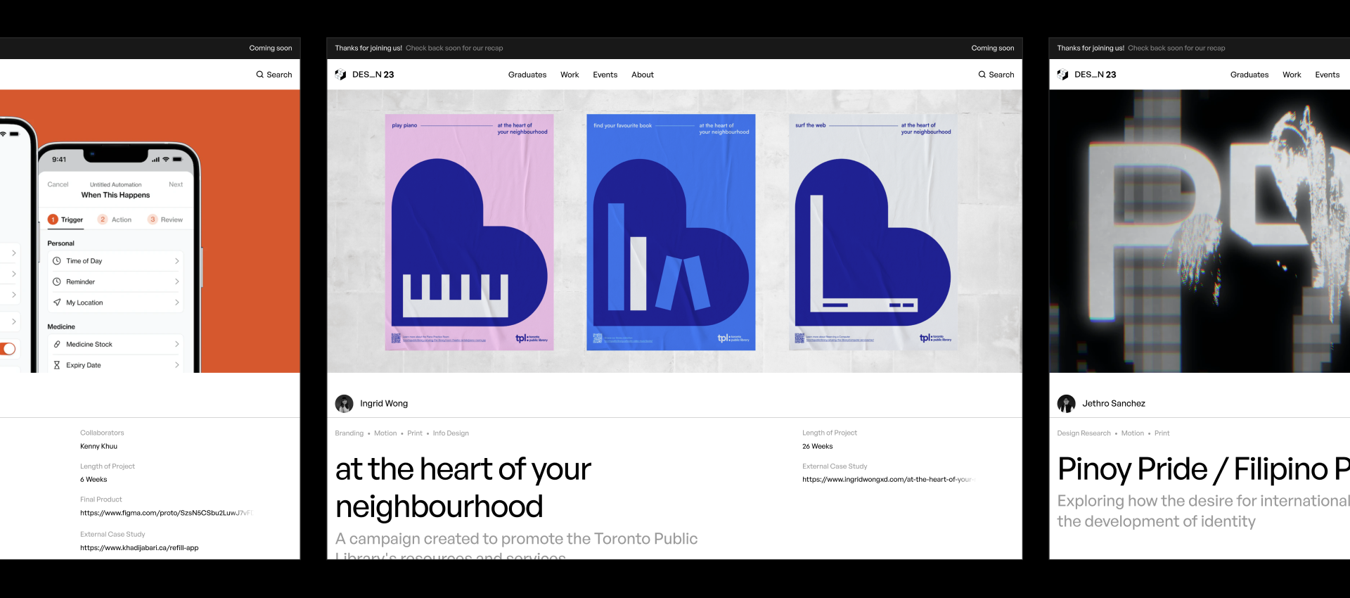 On a personal note, this project is significant because it marks the end of a four-year journey in design education. This program stretched and challenged me as a creative thinker, and introduced me to many incredible people along the way. Working alongside my colleagues and friends to properly showcase our cohort's culminating work was a fulfilling way to close out my time at York University. Conversely, this site also marks the beginning of a new era of designers. As the first cohort of graduates in the York Program in Design, it was a unique opportunity to introduce the wider community to a new program that is sure to produce high quality talent in the years to come.